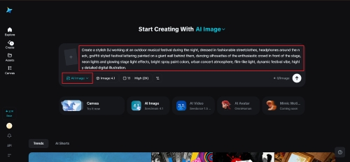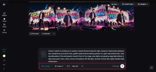 Begin by going to Dreamina and its creation interface. Pay attention to a description of a dynamic scene related to a music festival, one of the characters that depicts the mood of the event. Considering the clothes, lighting, and the kind of atmosphere in which the music is played.