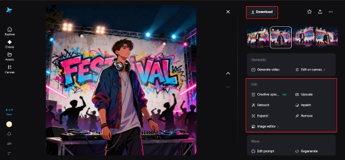 When your poster design is displayed, Dreamina provides you with an opportunity to edit it with built-in AI tools. Inpaint would allow you to edit specific sections of the picture, extend its background to create more patterns, shrink to bring redundant details into the picture, and retouch to sharpen the image lighting or texture. These customization tools assist in the creation of the generated image into a refined festival poster. Once the design appears flawless, all you have to do is click the Download icon to save the finished masterpiece on your device.